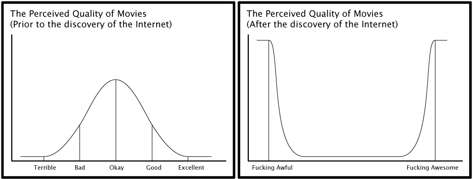 This was inspired by the almost universally negative reception that Transformers 2 is getting. It's currently at 19% on Rotten Tomatoes. To put this into perspective, Twilight is at 49%. Now I know that as a person who revels in some of the worst movies out there, my opinion on the matter might be a bit skewed but this is a little out of hand. That's not to say that Transformers 2 is a magnificent piece of art. It is what it is: a decent sci-fi action movie where giant technologically advanced robots punch each other with their fists and occasionally with big swords. Also, they transform into cars and stuff. It just really irritates me that nowadays, something is either the best fucking thing ever since the last thing that was awesome or it's the most godawful thing to have ever existed and it should be a crime for such a thing to exist. There is an extremely vast expanse of quality between awful and awesome. It would be very nice if the internet discovered its existence. |