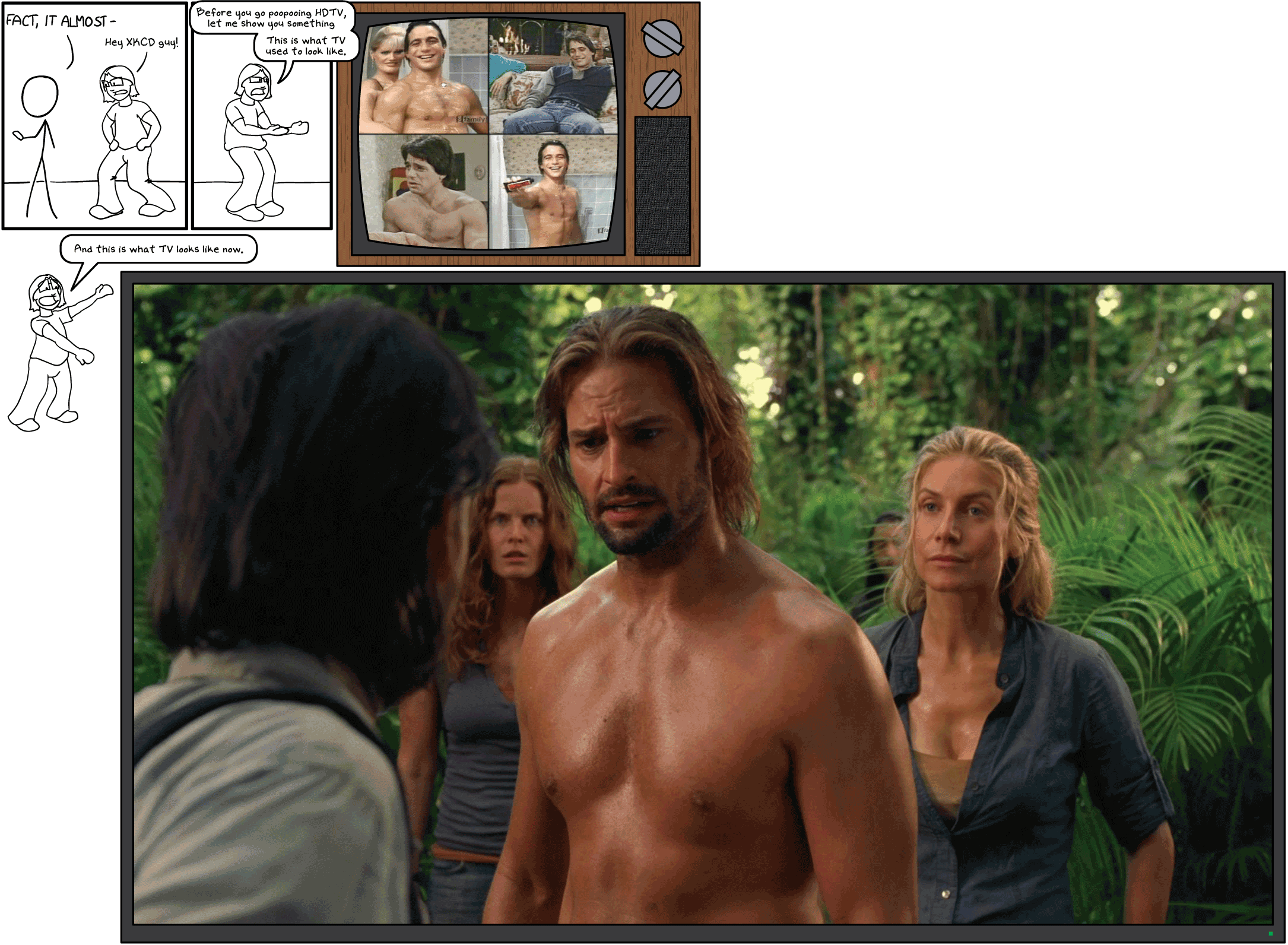 I hope most of you had to scroll to view the entire comic. I'll be honest: I sort of agree with XKCD for the most part. TV has not really changed in the past 80 years. It's a 2D image made of pixels that is transmitted from one place and viewed in another. The addition of color was a welcome upgrade but for at least the past 40 years, not much has changed. The TV we had when I was a kid looks pretty much like the TV my parents have now. If you don't count the various attempts at '3D' we've had in the past and the one happening right now, the two biggest things to happen in nearly a century of television was the addition of color and a slight increase in resolution. So, it kind of is not that impressive. BUT When you look at the evidence, such as that gorgeous specimen of a man above, it is hard to be dismissive of HDTV and what it can do for you. It has raised the bar for the expected image quality of television shows and I for one have no problem with that at all. |