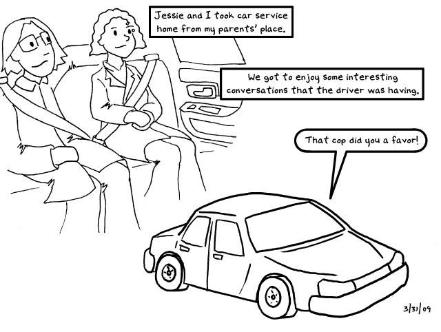 The guy our driver was talking to was complaining that a cop had taken away his knife and now he had to go and get another knife! Our driver said that he could've been thrown in jail. Later he got into how Hip Hop evolved out of Rock. When discussing the weather, our driver mentioned how earlier in the night, it was raining golf balls. The other guy corrected him by telling him that it was in fact raining gum drops. |